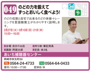 まちゼミとは まちゼミは「得する街のゼミナール」を略したものです。 岡崎市のお店の方が講師となり、専門的なノウハウをわかりやすく受講者の方にお伝えするイベントなります。 あいち補聴器センターでは、以下の講座を開講させてい […]